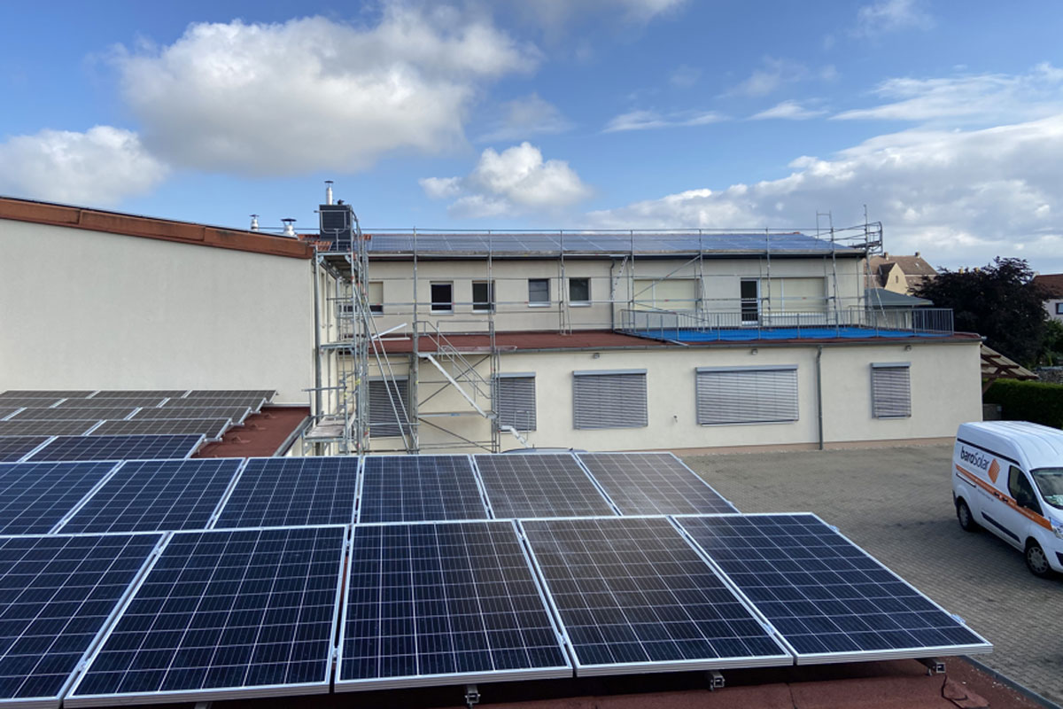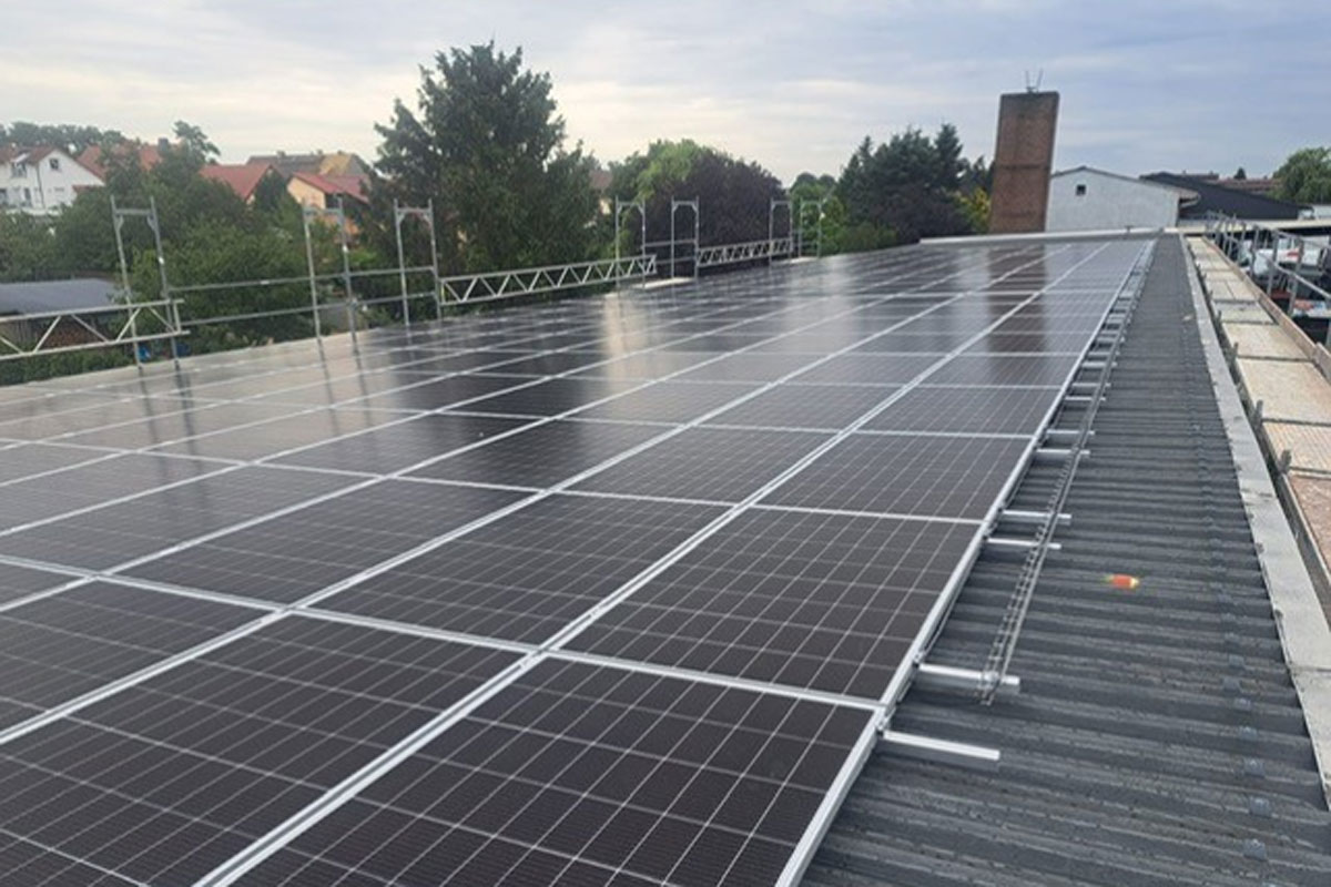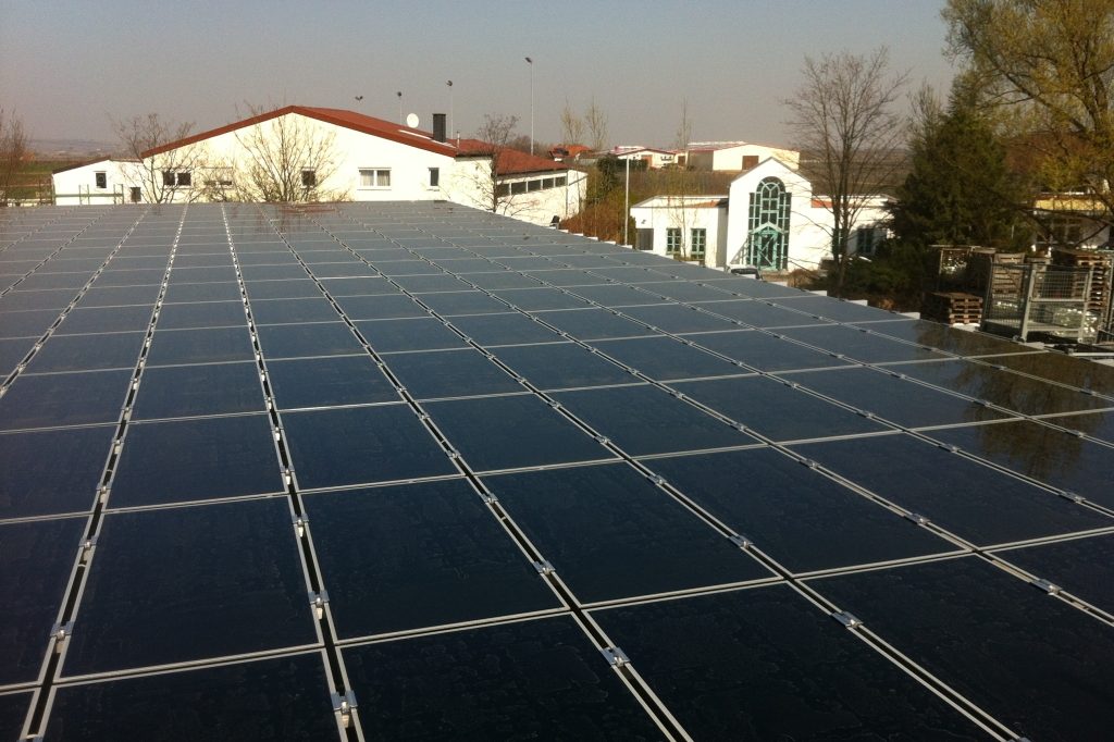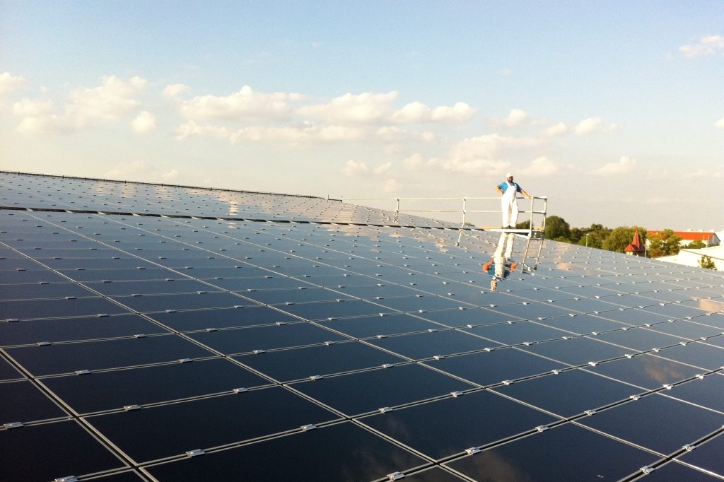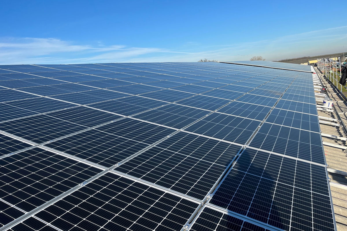 Große Photovoltaikanlage auf einem Flachdach bei klarem Himmel, Blick über die Modulflächen.