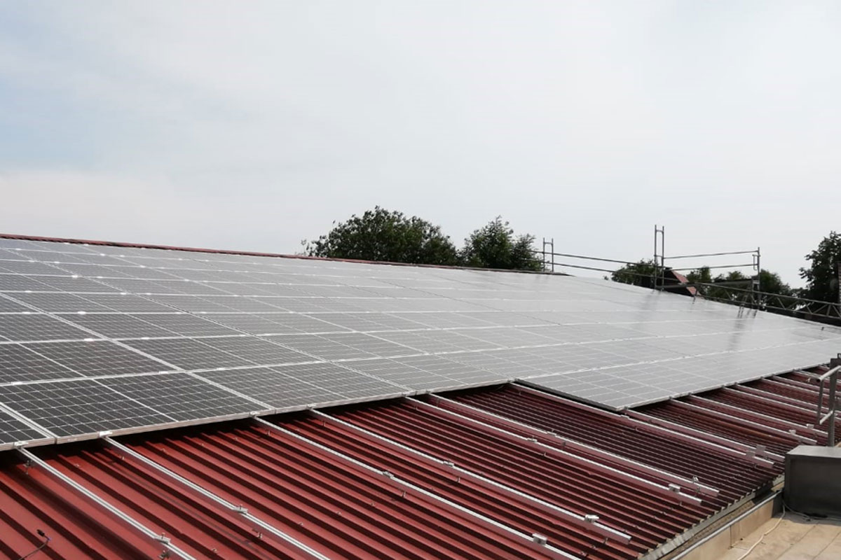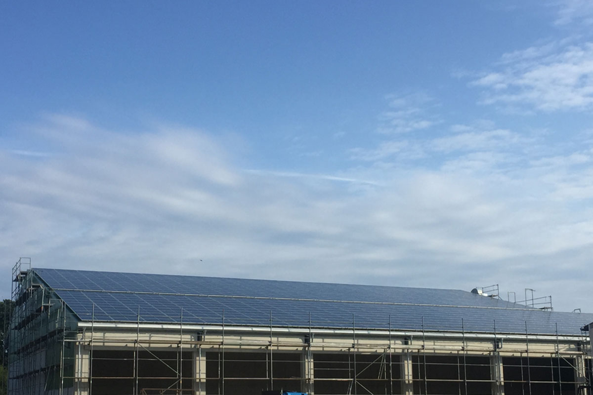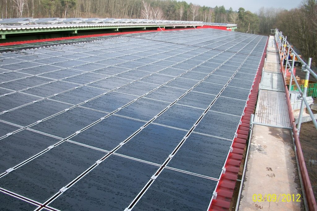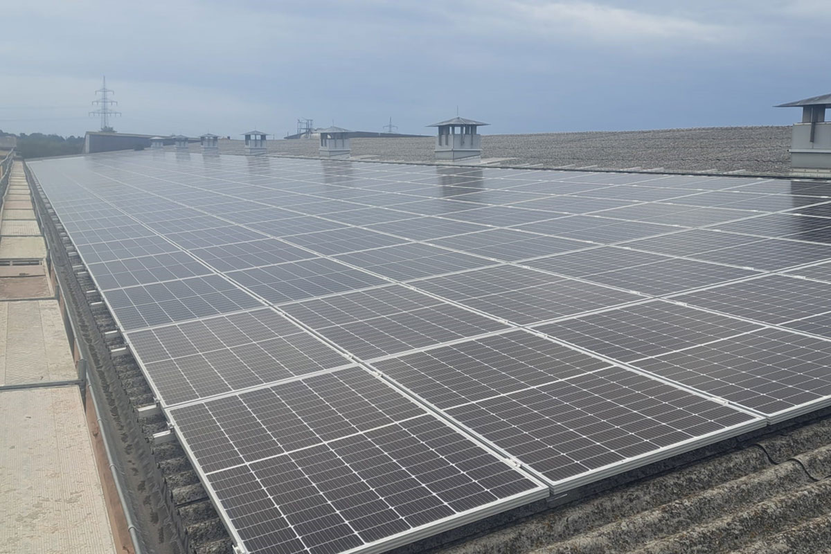 Große Photovoltaikanlage auf einem Flachdach bei klarem Himmel, Blick über die Modulflächen.